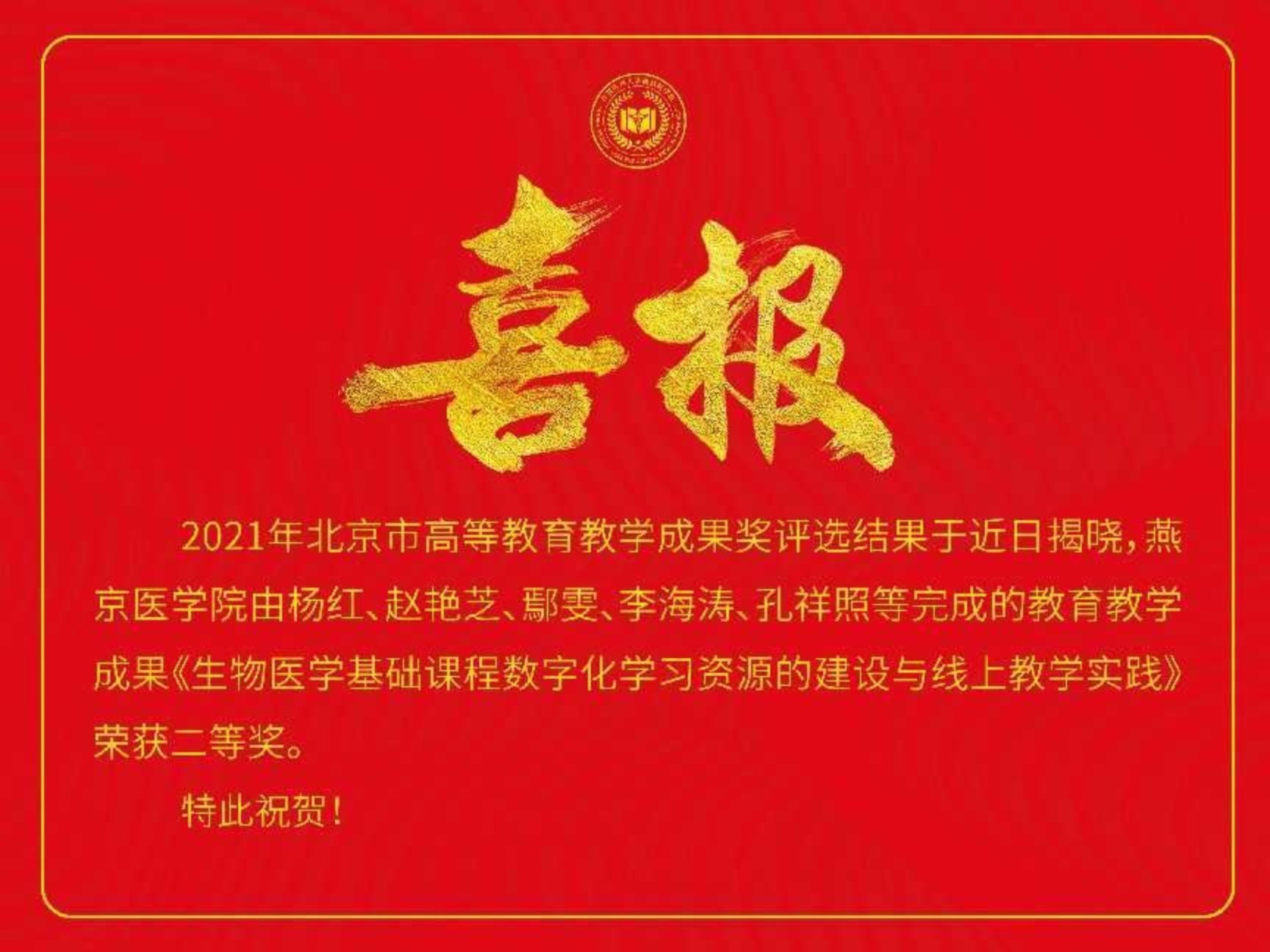 2021年北京市高等教育教学成果奖评选结果于近日揭晓,我院由杨红、赵艳芝、鄢雯、李海涛、孔祥照等完成的教育教学成果《生物医学基础课程数字化学习资源的建设与线上教学实践》荣获二等奖。