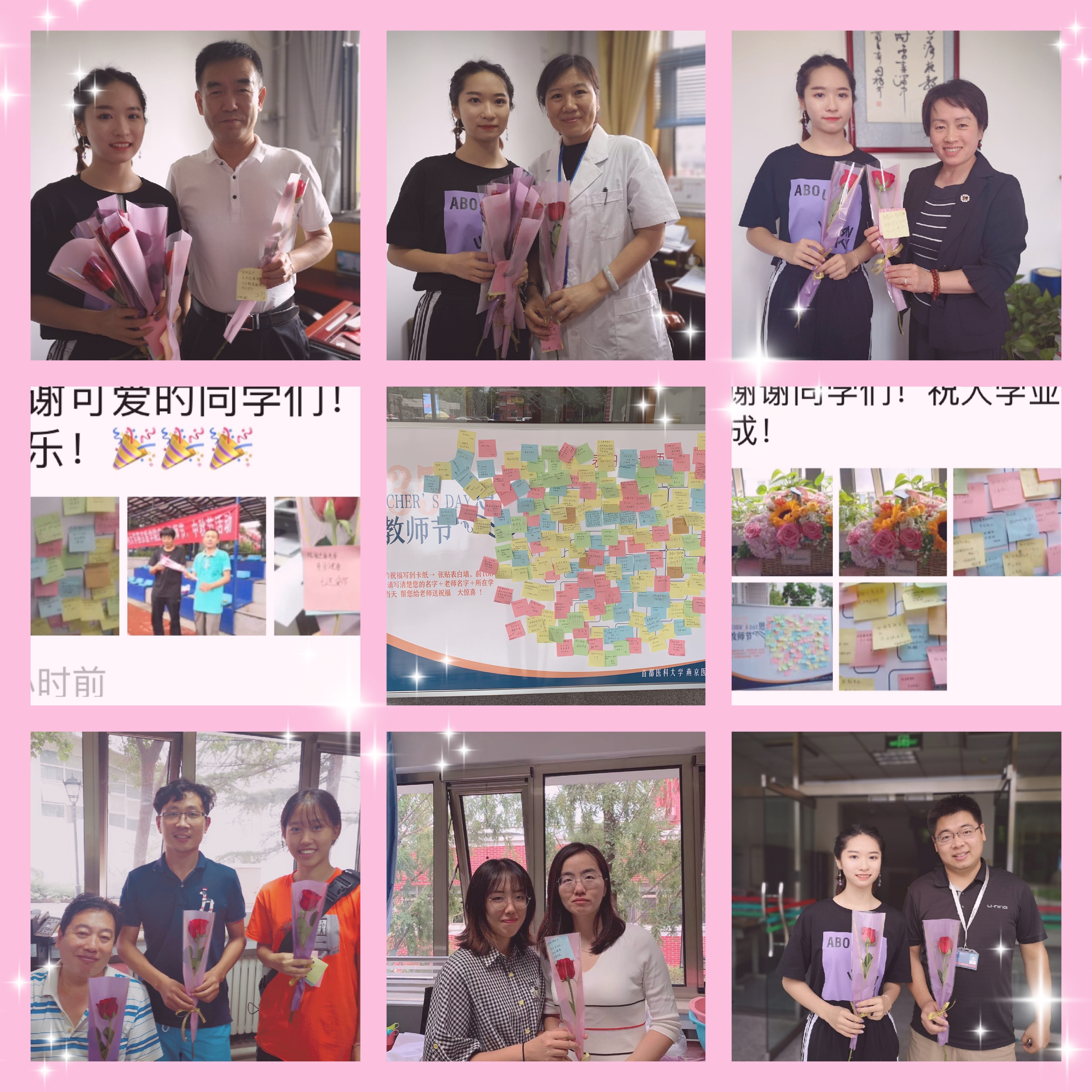 9月10日中午,秋雨过后,天气微凉,同人小说 “表白__老师”主题师生互动活动却进行得如火如荼,同学们的热情空前高涨,大家纷纷写下对老师的祝福和感谢,张贴在精心设计的“表白”墙上。 活动过程中,各学系老师纷纷参与进来,在看到同学们对自己的祝福时,时而露出惊喜的表情,时而湿润了眼眶,对这样一个富有创意和惊喜的教师节表示感动的同时,寄许同学们不负春光,为成为优秀的医疗工作者而努力、奋进。“表白”环节后,当天下午,学生志愿者把对应的祝福和美丽的鲜花送到每一位被“表白”的老师手中,老师们惊喜连连,喜悦之情溢于言表。