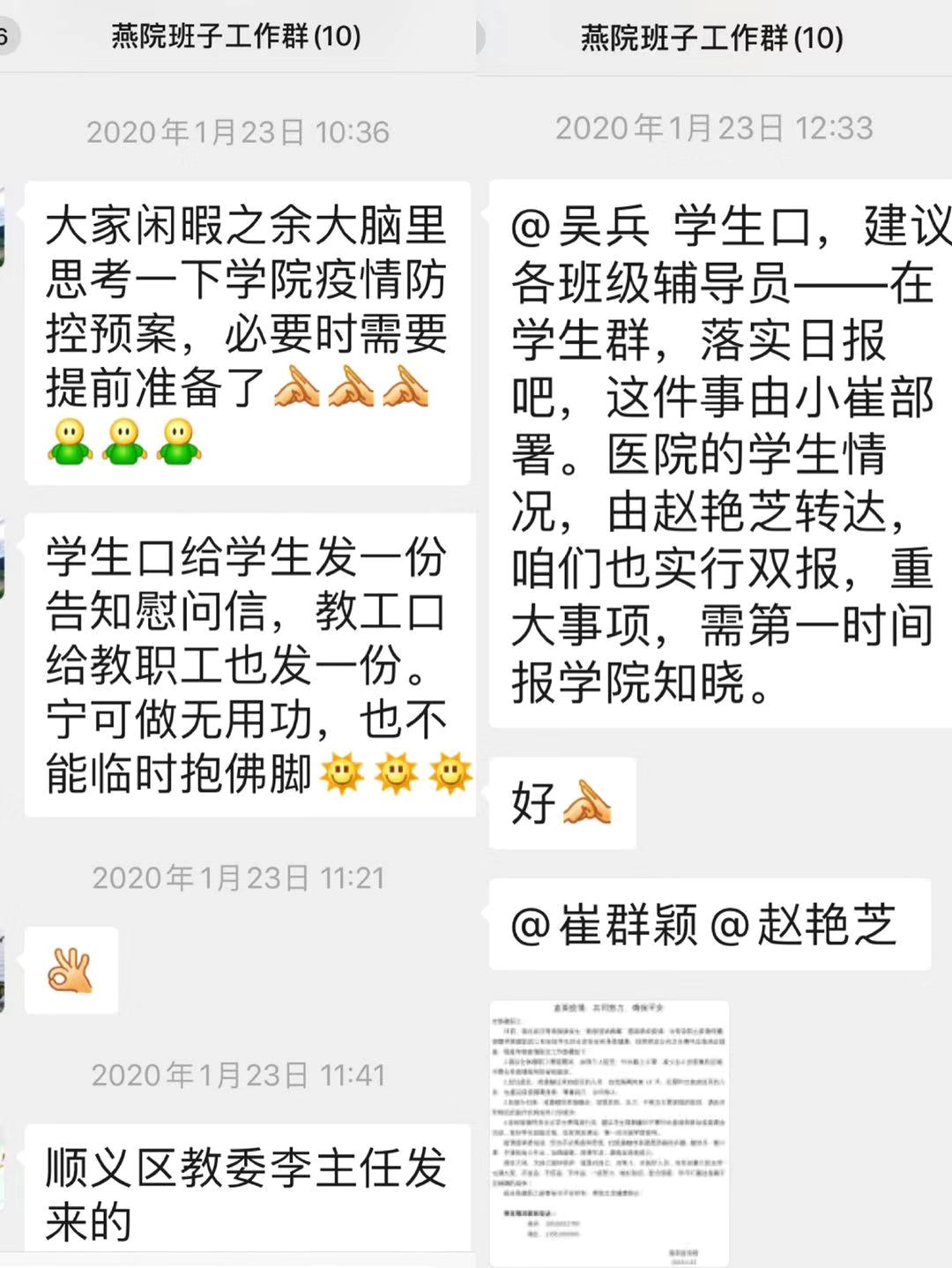1月23日,同人小说 班子成员第一时间启动疫情防控专题工作,建立了全覆盖的工作体系。第一时间向全院师生员工发布了《直面疫情、共同努力、确保安全》、《同人小说 开学返京有关工作预案思考》等一系列及时准确、暖心贴心的提示和通知;第一时间决定并落实同人小说 门诊楼做应急隔离房;第一时间建立同人小说 寒假疫情防控工作机制并成立领导小组,同人小说 党委书记吴兵、院长杨红担任组长,并设立了9个工作小组,负责教职工日报、学生日报、顺义区教委对接、卫生健康应急、安全保卫、后勤保障、应急物资采购、教学协调、宣传工作等工作;第一时间建立信息日报、零报告制度,完成了对所有教职工,尤其是湖北籍教职工(及其配偶、亲属)及近期有湖北行程往返师生情况摸排,落实“一对一”联系机制,跟进了解情况。