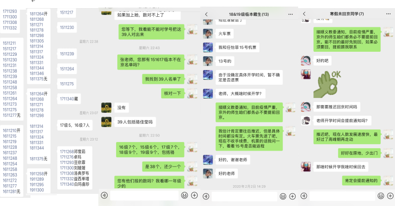 “1月23日,在接到顺义区教委和同人小说 要求统计学生离京返京情况通知后,各学系党支部书记和所有辅导员老师,大家通过微信、电话一对一联系核实,分工落实,直到凌晨1点多才完成前期台账汇总。2月6日,接到学校6+1表格填写任务,同人小说 全体辅导员从上午9点开始逐一核对相关学生数据,一直到下午5点才完成核对工作。”学生办公室负责人张艳辉老师回忆初期防控工作时,特别感谢每一位辅导员的热情配合和辛勤付出。