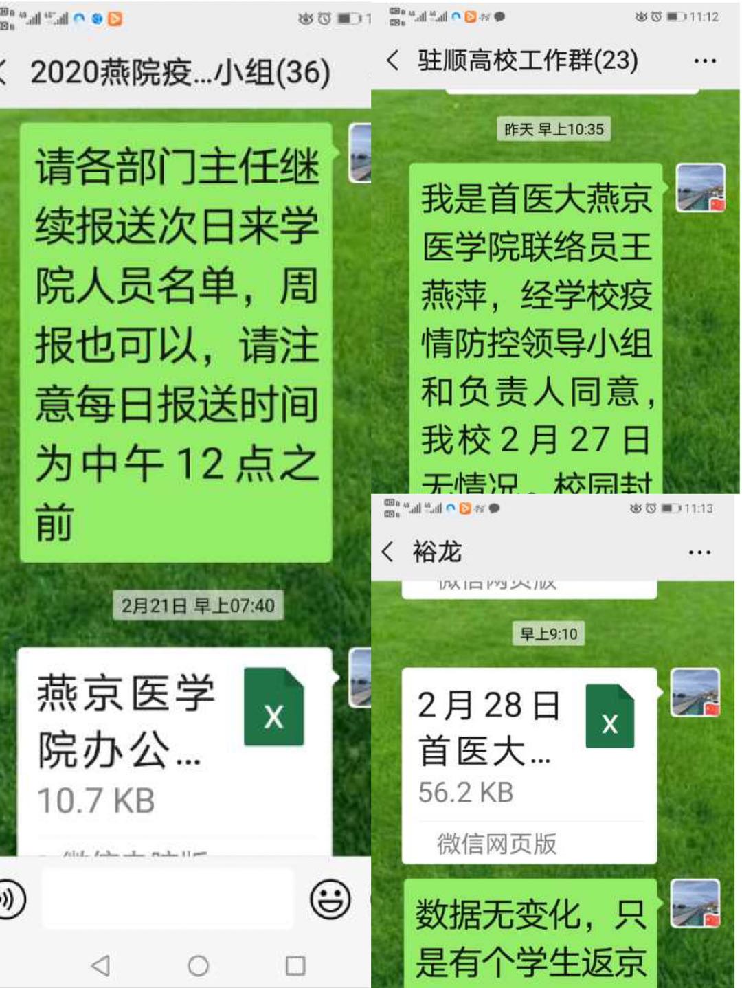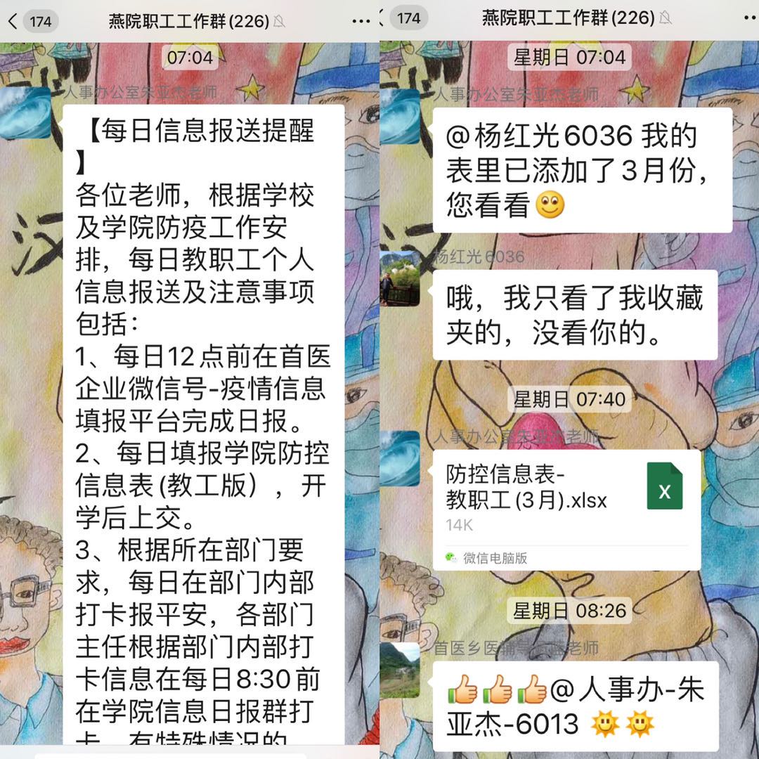 同人小说 办公室在防控抗疫期间的工作也换了“新颜”,除了每天需要逐一核实、统计和上报同人小说 班子成员和科室职员的外出地点、接触人员、身体健康状况等信息,每天统计申请返校教职工的情况报党委审批,报备保卫办公室以外,作为同人小说 联络员,王燕萍老师需要对接顺义区教委,配合属地管理,每天汇总同人小说 最新情况,教职工和学生分类统计最新数据,精准无误地报送给顺义区相关部门,同时做好对顺义区相关部门来院检查接待准备等工作。“疫情期间,院办接到最大挑战的工作是对是离退休人员的摸排。那天下午四点多接到学校通知,主要是逐一核实老同志是否在京,我们只能利用微信群和电话两种方式联系,微信群只有64个人,其他人(116人)都需要打电话进行询问,有的老同志可能需要打几次才能联系上,直到晚上十点多才完成180位离退休职工的第一轮核实工作,第一时间报送给学校办公室”,王燕萍老师提到同人小说 疫情防控工作时说,“这段时间工作最大的不同是需要一直盯着手机、看着电脑,生怕错过一条工作信息,防控没有周末,需要每一天绷着弦儿,及时、细致、真实的核实每一条数据”。
