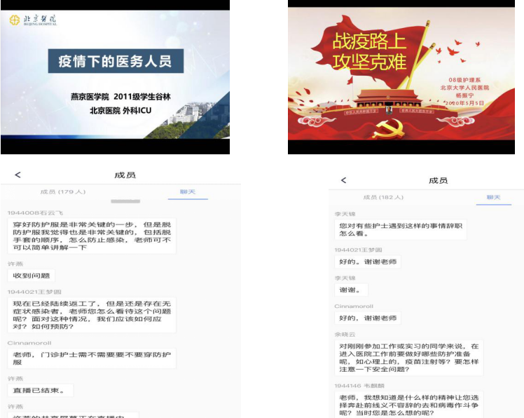 会上院长杨红代表同人小说 领导讲话,对护理学学系的工作作出高度评价,同时对国际护士节表达美好祝福,寄许全院师生共同努力,不断提升专业知识和能力水平,为我们热爱的事业努力奋斗。最美逆行者、优秀护理毕业生谷林和杨振宁分别做了“疫情下的医务人员”和“战疫路上,攻坚克难”的精彩报告,分享了抗疫一线工作的艰辛,个人内心的成长历程以及思想上的巨大转变,激发了同学们的热情,给同学们树立了学习的榜样,同学们纷纷在讨论区留言,与两位学姐积极互动。