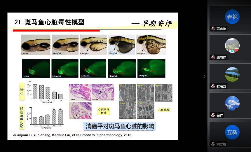 张云研究员讲到,在新药早期安全性评价领域,斑马鱼实验模型安全性评价体系具有灵敏、可靠、快速、准确、高通量、成功率高等优势,可以提高新药研发的效率和安全性,降低新药研发的成本,从而更好地推动药物研发进程。在药物活性筛选方面,张云研究员介绍了抗肿瘤、抗血栓、心脏保护、抗炎、抗氧化、促血管生成等方面研究的模型;此外,还就毒性评价中的一般毒性、发育毒性、神经毒性、器官毒性(心脏毒性、肝毒性、肾脏毒性、胃肠毒性、耳毒性等)和生殖毒性等方面研究,进行了精彩分享。最后,以消癌平对斑马鱼胚胎形态发育的影响、PM2.5水溶性成分对斑马鱼幼鱼脑血管危害为例,对新药早期安全性评价与化学物质毒性评价实验研究进行了全方解读。