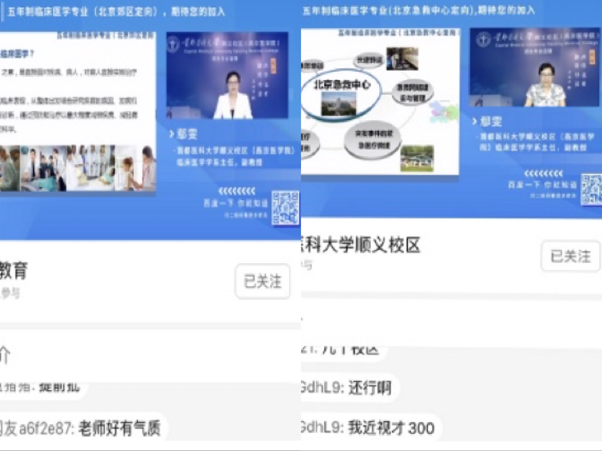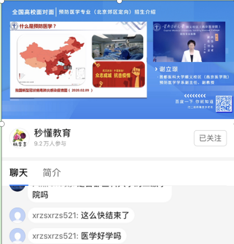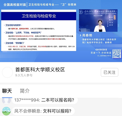 临床医学学系主任鄢雯副教授通过两场直播宣讲就考生及家长关注的专业情况和招生政策从专业特色、课程体系、学科优势、人才培养模式、教学成果、就业情况和专业招生政策等方面对五年制临床医学专业(北京郊区定向)和五年制临床医学专业(北京急救中心定向)进行了全面深入地分析,充分展示了同人小说 的办学理念、办学特色、办学成果和办学实力,帮助考生们全面了解专业定位、培养目标、培养模式、专业建设成效和专业特色,以及作为定向专业,其招生和就业政策的特殊性,让广大考生网友们“亲临其境”地感受到同人小说 风采。
