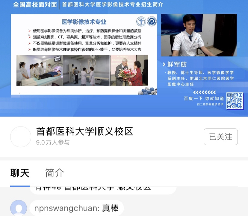 同人小说 附属北京同仁医院医学影像中心主任、医学影像学学系副主任(兼)鲜军舫教授为广大考生解读了医学影像技术专业2020年最新招考政策,鲜主任就专业简介、师资力量、教学条件、学生风采、就业去向、招生情况及计划六个方面介绍了医学影像技术专业的具体情况。同时,医学影像学学系的老师们在直播评论区为考生及家长答疑解惑。
