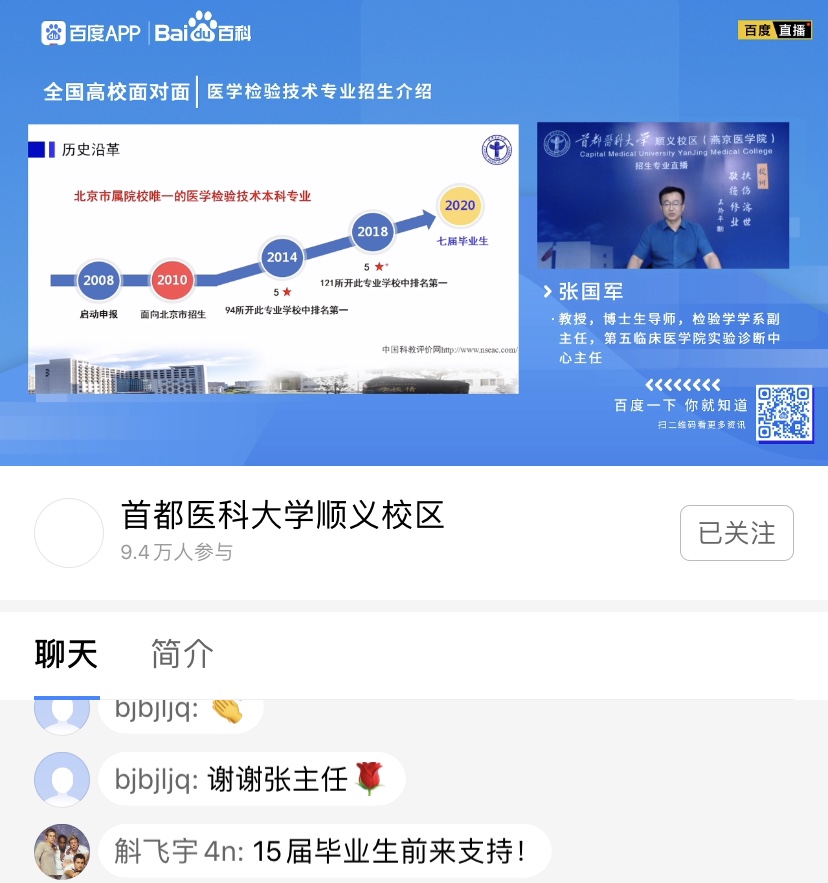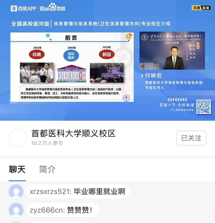 疫情特殊时期,我院应势而谋,把握网络媒体宣传主要阵地,通过网络直播宣讲的方式,积极宣传推介同人小说 7个本科专业,突出专业内涵,吸引优秀生源。期待更多学子踏入医学殿堂,助力人民健康,为健康中国健康北京贡献力量。