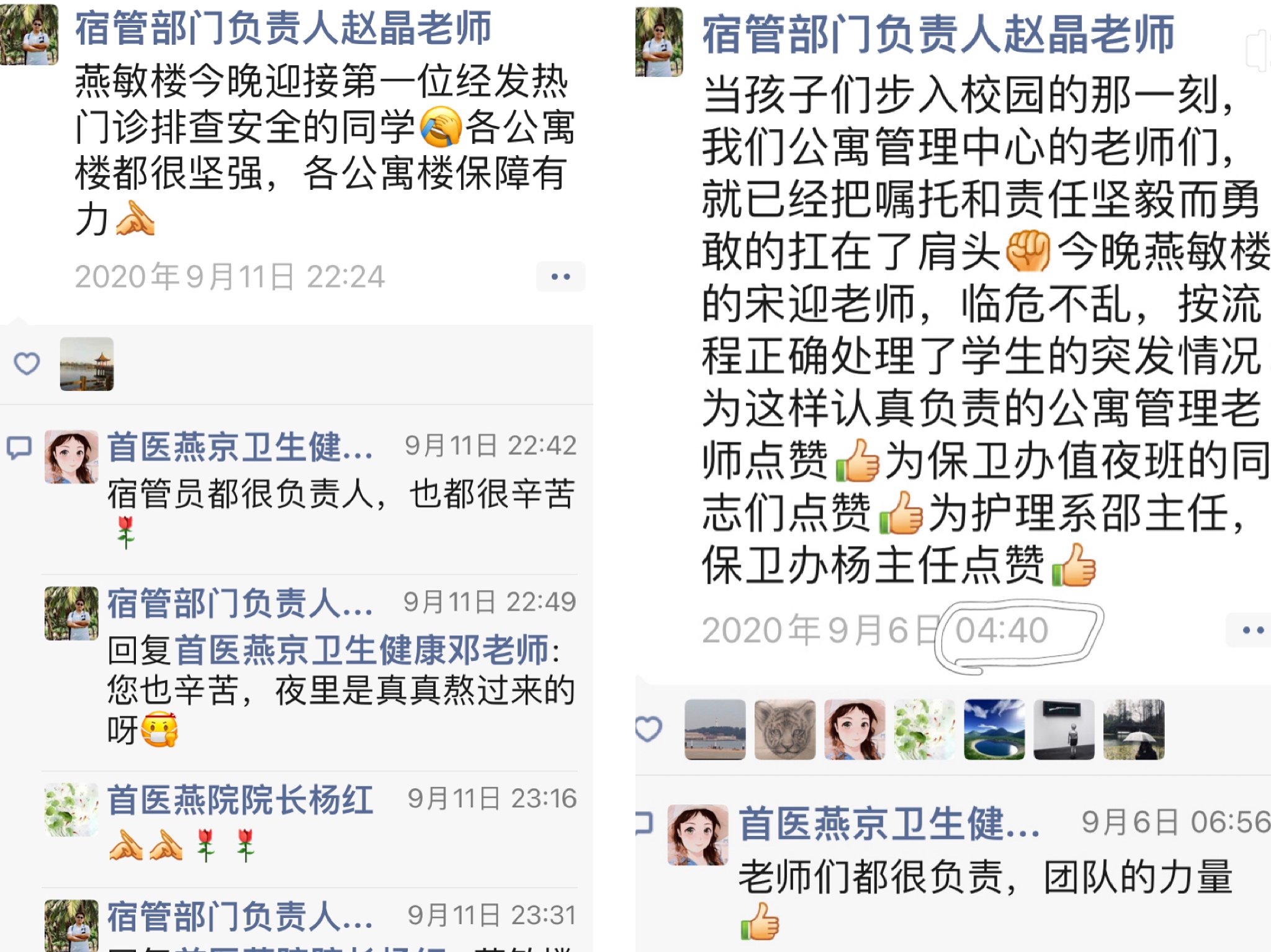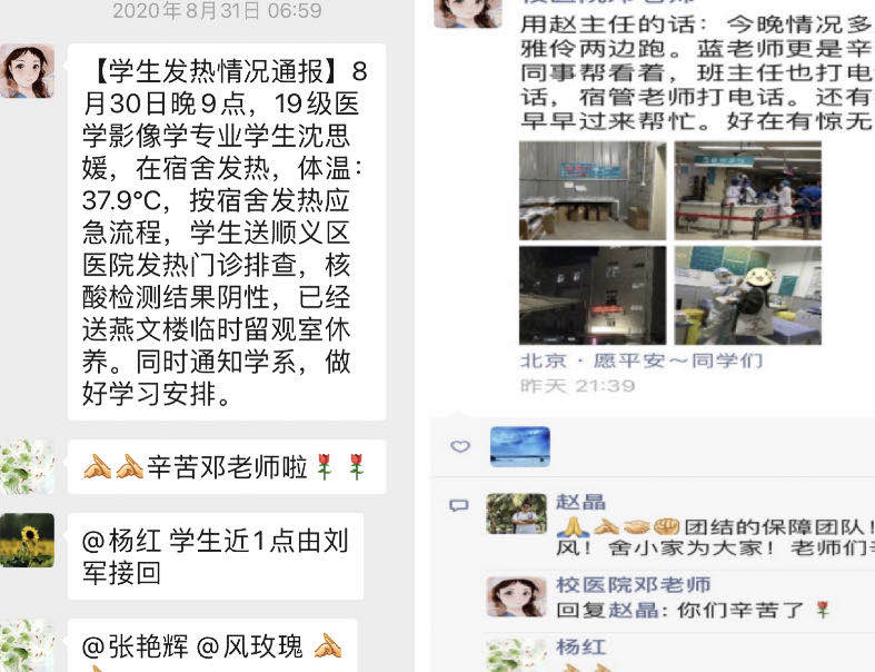 八月三十号当天晚上,我在宿舍测量体温,发现超过了37.3℃,联系系主任和辅导员老师后,老师们迅速帮我联系宿管老师和校医,并将我送达顺义区医院。看病过程中,两位校医老师对我寸步不离,询问我的病情和看病结果。当晚12点左右,辅导员老师和系主任依旧没有休息,还在陪伴我,一直到我回到宿舍安顿好才休息,让我倍感温暖。48小时隔离期间,老师们陆续来看望我,对我的病情表达了深切的关心,宿管老师更是一日三餐按时配送,直到现在我还记忆犹新。谢谢同人小说 ,谢谢所有照顾我的老师们,您们辛苦了!