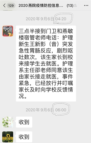 9月6日凌晨三点,当天刚来报道的2020级护理系新生王思颖同学因突发胃疼,脸色发白,呕吐不止。宿管值班老师第一时间把学生安置在值班室沙发上休息,并帮助检测体温,学生当时体温36.8度,虽然松了一口气,但是鉴于学生胃疼不止,宿管老师决定把学生及时送往医院。因为同人小说 规定疫情防控期间,只有具备学系盖章的手续才能出校门,为了第一时间把学生送往医院救治,宿管部门负责人赵晶老师第一时间联系了护理学学系的邵广宇主任和保卫办公室杨维海主任,经过多部门的配合和协调,达成了先就诊再补办手续的方案,学生第一时间被送往医院,得到及时治疗。宿管部门负责人赵晶老师提到这件事时说,“此次学生突发情况的顺利解决,离不开公寓值班老师的认真负责、恪尽职守,更离不开相关部门领导对我们工作的信任和支持”。