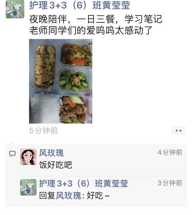 学系老师纷纷做起志愿者,异址教学保证发热不停学。考虑到大部分学生出现发烧情况均是夜间,同人小说 根据学生就医频率,在各学系尝试征集可以在夜间陪同发热学生与卫生保健室老师一起就医的教师志愿者。各学系老师踊跃报名,纷纷加入到服务学生工作的志愿者队伍中。同时为了保证因发烧而隔离观察的同学有学习的渠道,各学系积极准备教学预案,通过腾讯会议、蓝墨云班课等方式开展异址教学,保证学生发热不停学,课堂在身边。