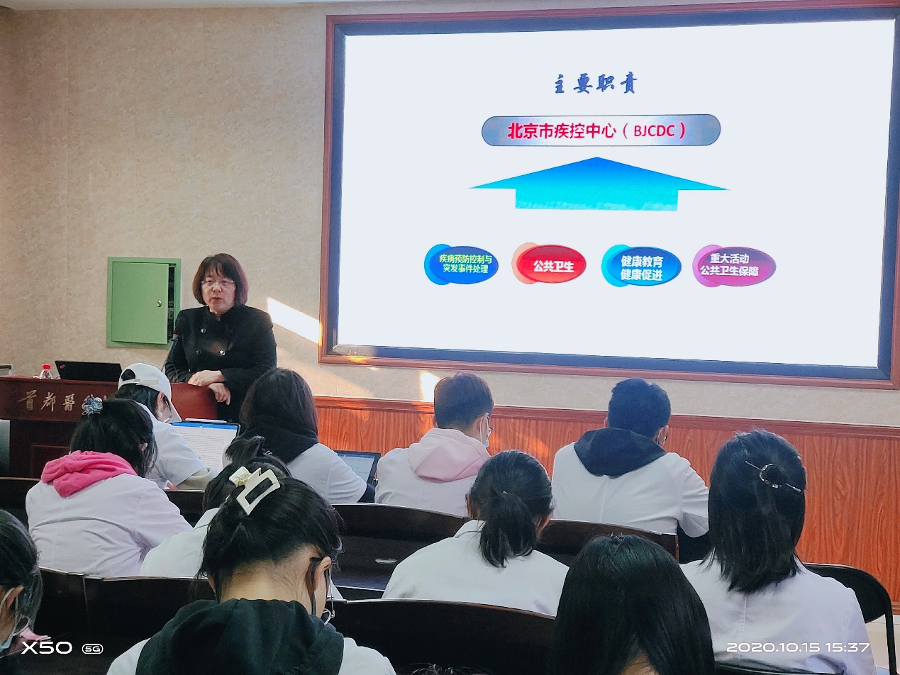 交流环节中,赵榕老师为大家介绍了北京市疾病控制中心的工作内容,举例介绍了由疾控中心需要完成的公共卫生突发事件的应急处理、复工复学指导、公共场所消毒防疫等工作 。赵榕老师以一个个鲜活的事例,鼓励同学们要学好专业知识,夯实基础、储备力量,为做一名合格检验人做好充分准备,将来为首都卫生事业做出应有的贡献。