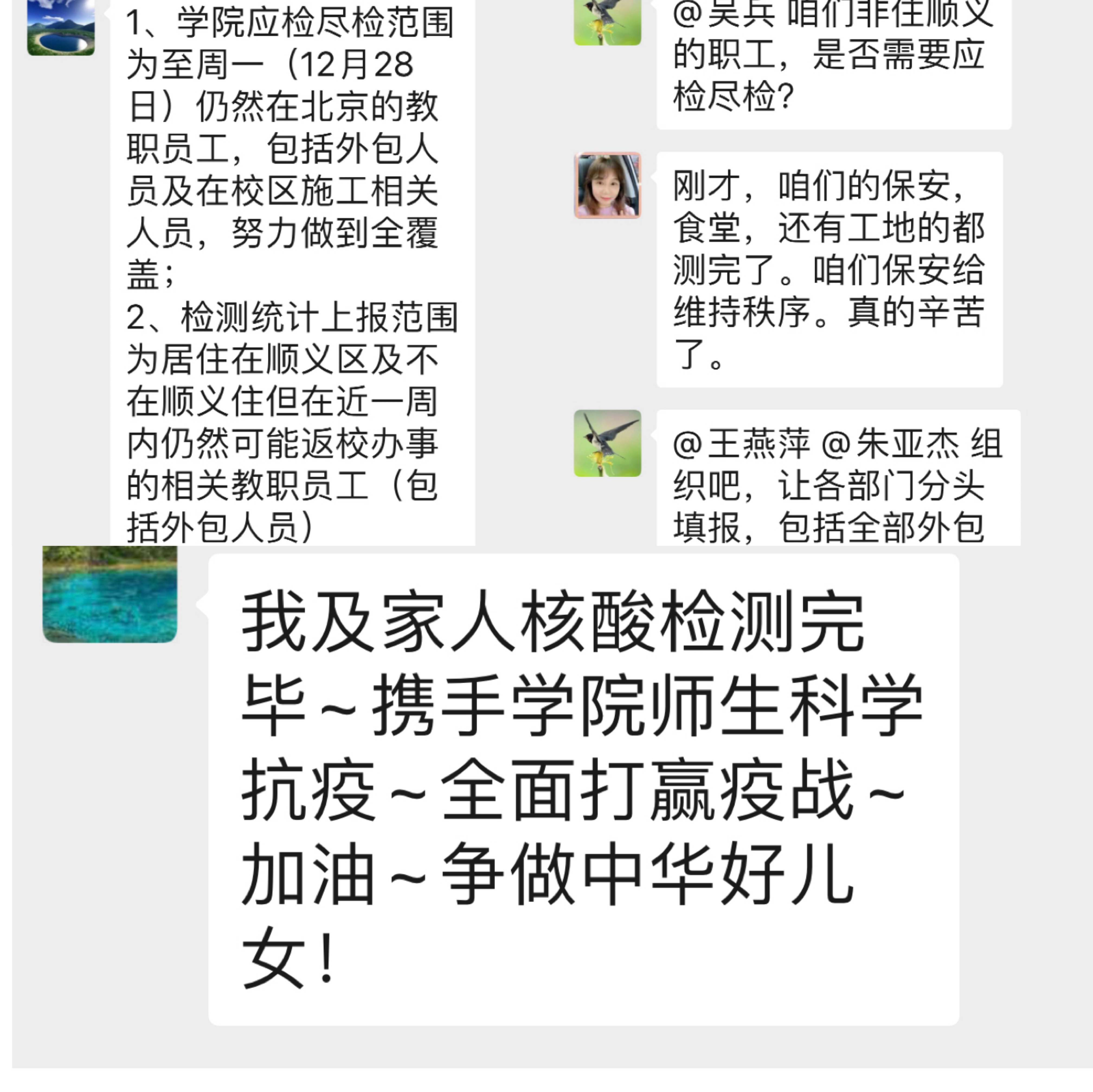 同人小说 通过多种新媒体渠道引导师生员工增强防护意识,科学佩戴口罩,做到勤洗手、常通风、与他人保持1米以上社交距离等卫生健康习惯;倡导教职员工在京过节,非必要不出京、非必要不出境、非必要不聚集、非必要不前往中高风险地区;切实做到不传谣、不信谣、不传播非官方的、未经证实的疫情信息,不盲目、不焦虑、不恐慌,用科学精神、正确方式、理性态度对待疫情。12月26日、27日同人小说 组织全院师生员工、保卫、保洁和餐饮人员进行核酸检测,同人小说 广大师生高度配合顺义区“应检尽检”的相关要求,及时通报个人检查进度,做好信息上报工作。
