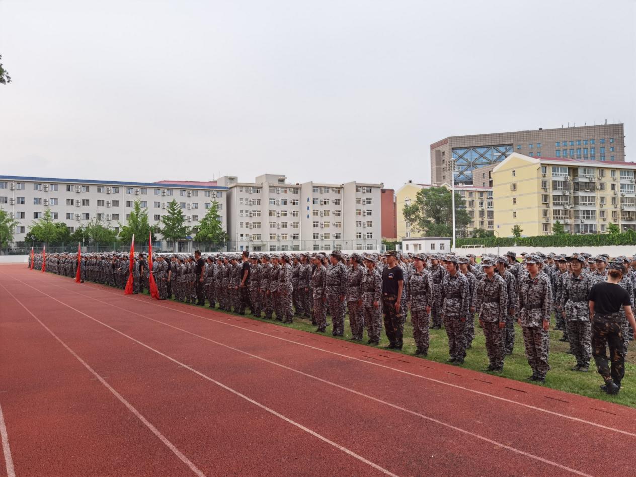 2020级全体学生,身着统一的军训服,排成整齐的方队,在同人小说 操场参加军训动员会暨开营仪式
