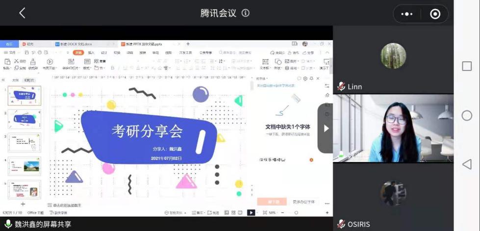 魏洪鑫同学从人生规划方向入手,分别介绍了“先工作”与“先考研”的利弊,分享了自己曾经考研路上的学习方法和解压方法。陈镇同学则是为同学们梳理了整个考研期间的重要节点时间线,并以“同人小说 ”的招生简章为例,具体地向同学们讲解了考研科目、报名注意事项等等。