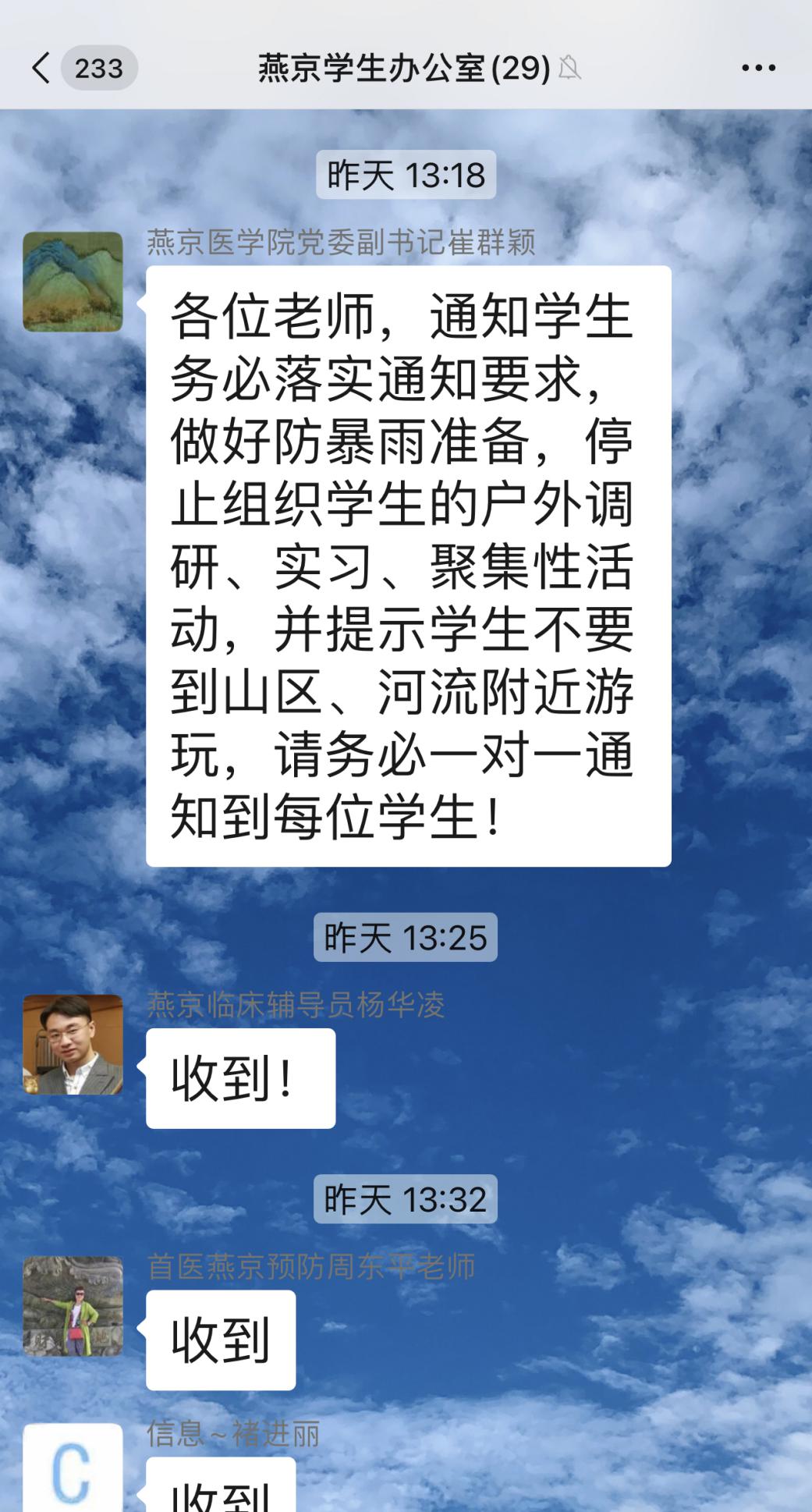 7月11日,同人小说 院长杨红第一时间在同人小说 中层工作群安排防汛相关工作要求,在职工工作群向全院师生发布汛情信息。