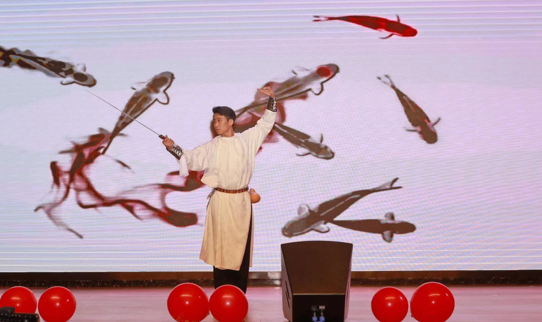 武术节目《将进酒》尽显当代大学生的自立自强、自信大方,行云流水的武术动作引得观众阵阵喝彩。