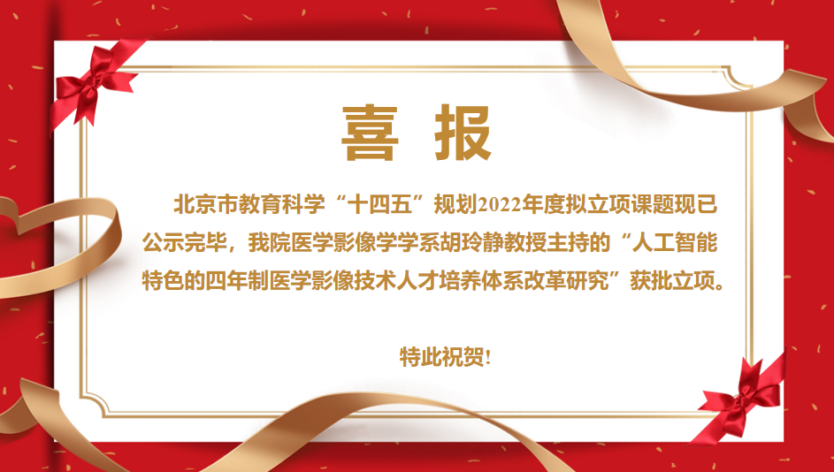 胡玲静教授主持的“人工智能特色的四年制医学影像技术人才培养体系改革研究”获批立项。