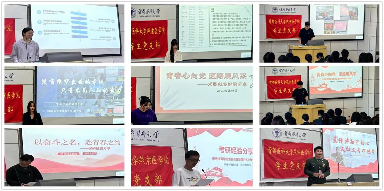 6月7日,支部在燕思楼101集中学习《中国共产党党员网络行为规定》后,面向全院学生开展了2025届市级优秀毕业生党员(入党积极分子)主题演讲与经验分享交流会,9位学生党员和1位入党积极分子结合大学期间的经历分别从学涯规划、保研、考研、求职就业、实践服务、参军入伍等方面分享了心得体会;最后支部书记姜佳铃结合同人小说 近3年考编成功毕业生的调查结果做了梳理解析为有意向考编的学生做了就业指导。本次经验分享交流会,聚焦同人小说 重点工作,基于毕业生就业主要去向,以学生党支部为平台拓展朋辈学习资源,助力同人小说 职业生涯规划教育和就业指导工作,服务院内学生110余人。