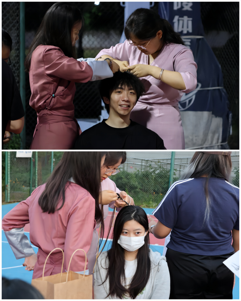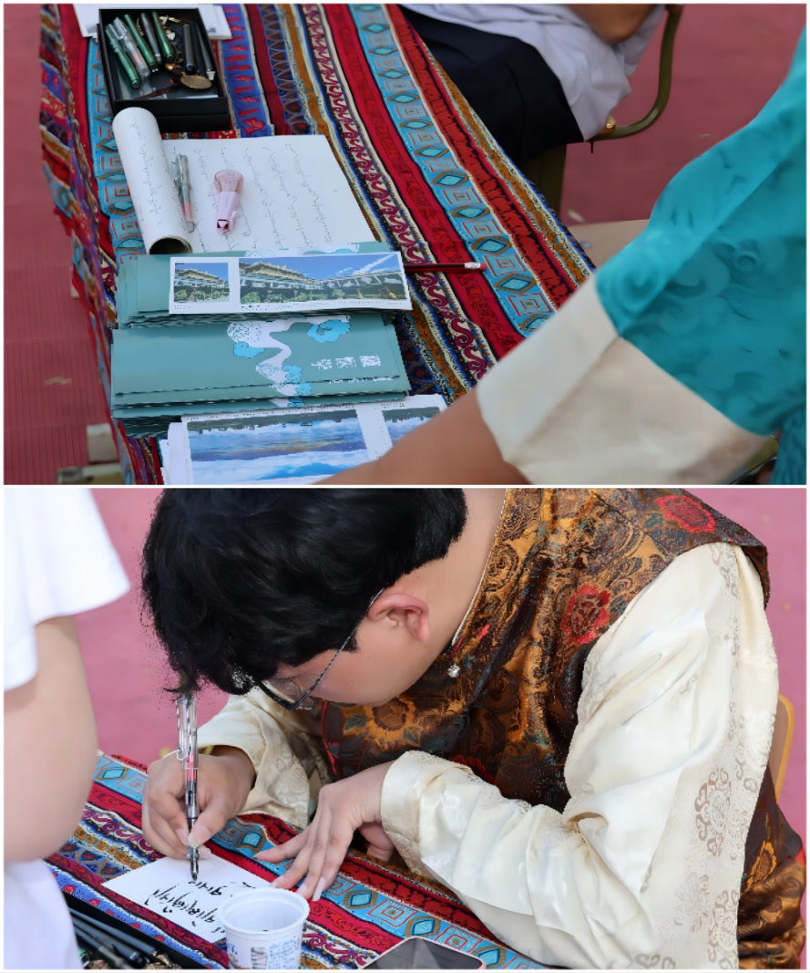 在藏式特色活动体验环节,童噶社在各活动摊位上展示了别具特色的藏族服饰文化、饮食、藏文字及藏式游戏等。在藏族同学们的带领下,同学们不仅可以品尝到甜茶、奶渣糖等独具风味的藏族零食,还可以领取藏族同学们亲手书写的藏文祝福卡片,此外,同学们还尝试编彩辫、试穿藏族服装,感受藏族生活方式,领略藏文化魅力。