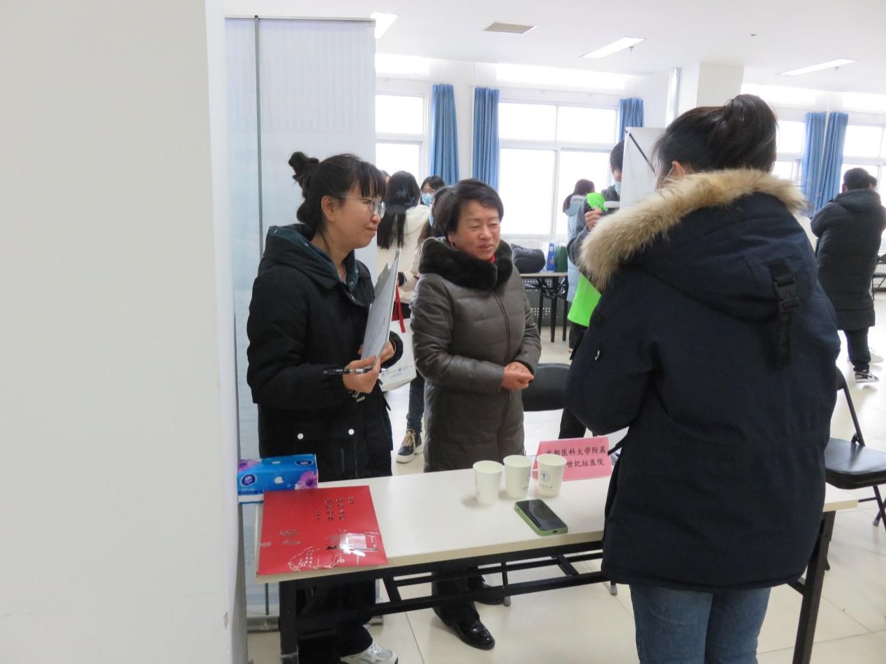12月12日上午十点,在同人小说 餐厅三层学生活动中心多功能大厅,七家医院如期就位。应聘学生手持自己精心准备好的简历,充满自信,积极和招聘医院工作人员交流,主动了解用人单位情况。本次招聘会共有近百名学生投递了个人简历,3家医院现场面试70余人次,现场达成就业意向20余人。上午,我院分管就业工作的崔群颖副院长到招聘会现场与各家医院招聘人员一一进行见面沟通,希望通过校院合作,加强联系,共同推进毕业生就业,同时满足医院用人需求。