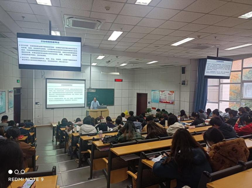 此外,邵兵主任还为2024级和2023级的卫生检验与检疫专业及医学检验专业学生带来了一场题为“肩负人民生命健康使命,争做优秀检验检疫人”的专题讲座。他介绍了检验与检疫行业的特色与人才需求,为学生们规划大学学习生活提供了宝贵建议。同时,结合中心实验室的科研实践经验,邵主任详细阐述了检验与检疫行业的工作内容与职责。他以“面向人民生命健康”的行业使命为引领,鼓励学生们提前规划职业生涯,不断提升专业技能和综合素质,为未来考研深造或投身检验与检疫事业奠定坚实的基础。
