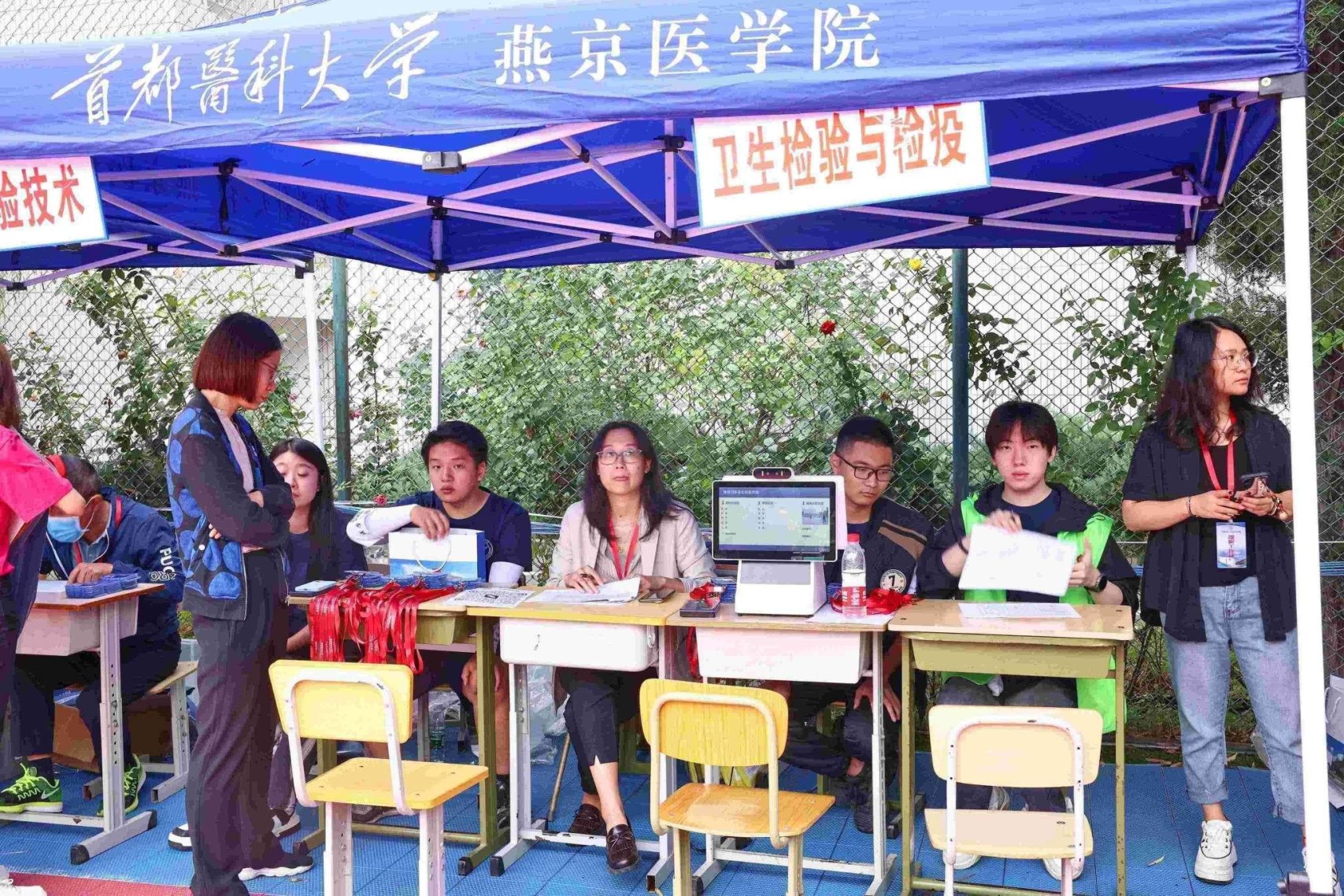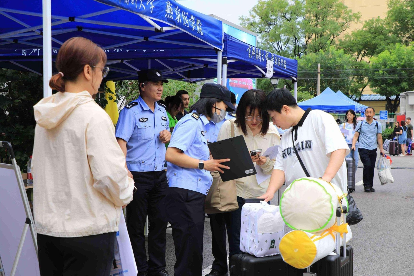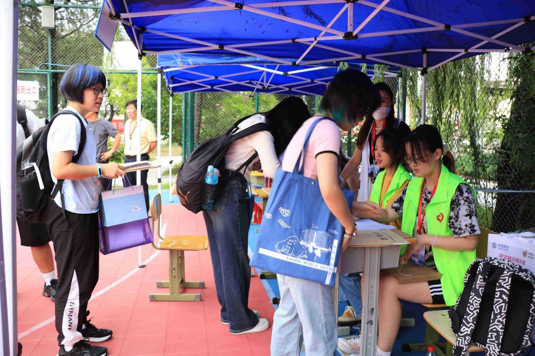 报到现场,各学系、各部门工作人员和志愿者早早做好准备,迎接新同学的到来。