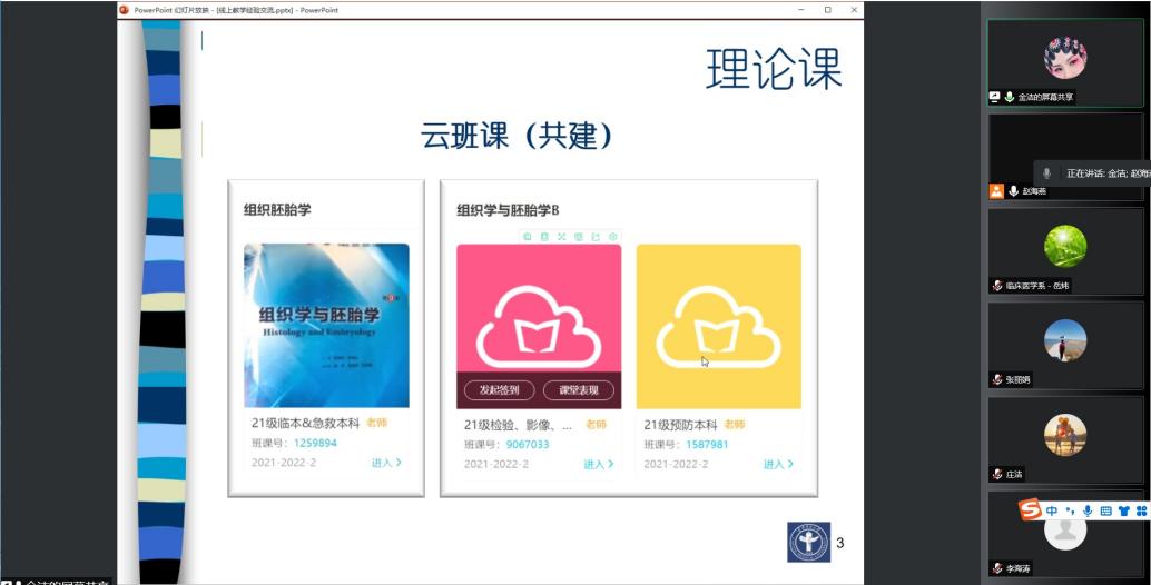 金洁老师从《组织学与胚胎学》理论课和实验两方面进行了分享,理论课重点分享了云班课嵌入的钉钉直播的使用小技巧和组织学与胚胎学理论课的线上课堂设计。实验着重介绍了医学形态学数字化教学平台的应用。将动态观察组织学标本搬到了线上,确保了教学标准不缩水、教学质量不降低。