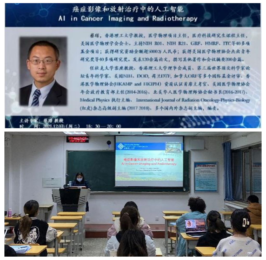 12月7日,医学影像学学系邀请知名学者、香港理工大学蔡璟教授,为同人小说 师生带来题为“癌症影像和放射治疗中的人工智能”的线上讲座,这是医学影像技术学科系列讲座中的第一场。学系主任胡玲静主持本次讲座,副主任胡贵祥、学系部分教师及各年级同学代表参加此次讲座。