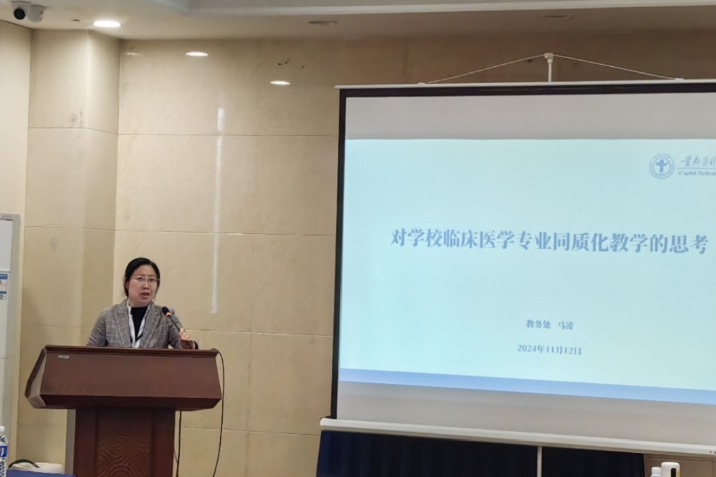 马凌副处长做了题为《对临床医学本科专业教育教学同质化的思考》的精彩报告。她从组织体系、师资队伍培训、教学督导、临床统考等方面采取了一系列措施促进教学同质化,让大家对同质化问题有了更加全面和深入的理解。同时,还针对基于学校为促进教育教学同质化所采取的措施,为临床医学定向专业的教学同质化建设指明了方向,提出了一系列富有建设性的建议。马凌处长强调,在保持教育质量底线的同时,更应该注重培养学生的创新思维和实践能力,推动医学教育的多元化发展。