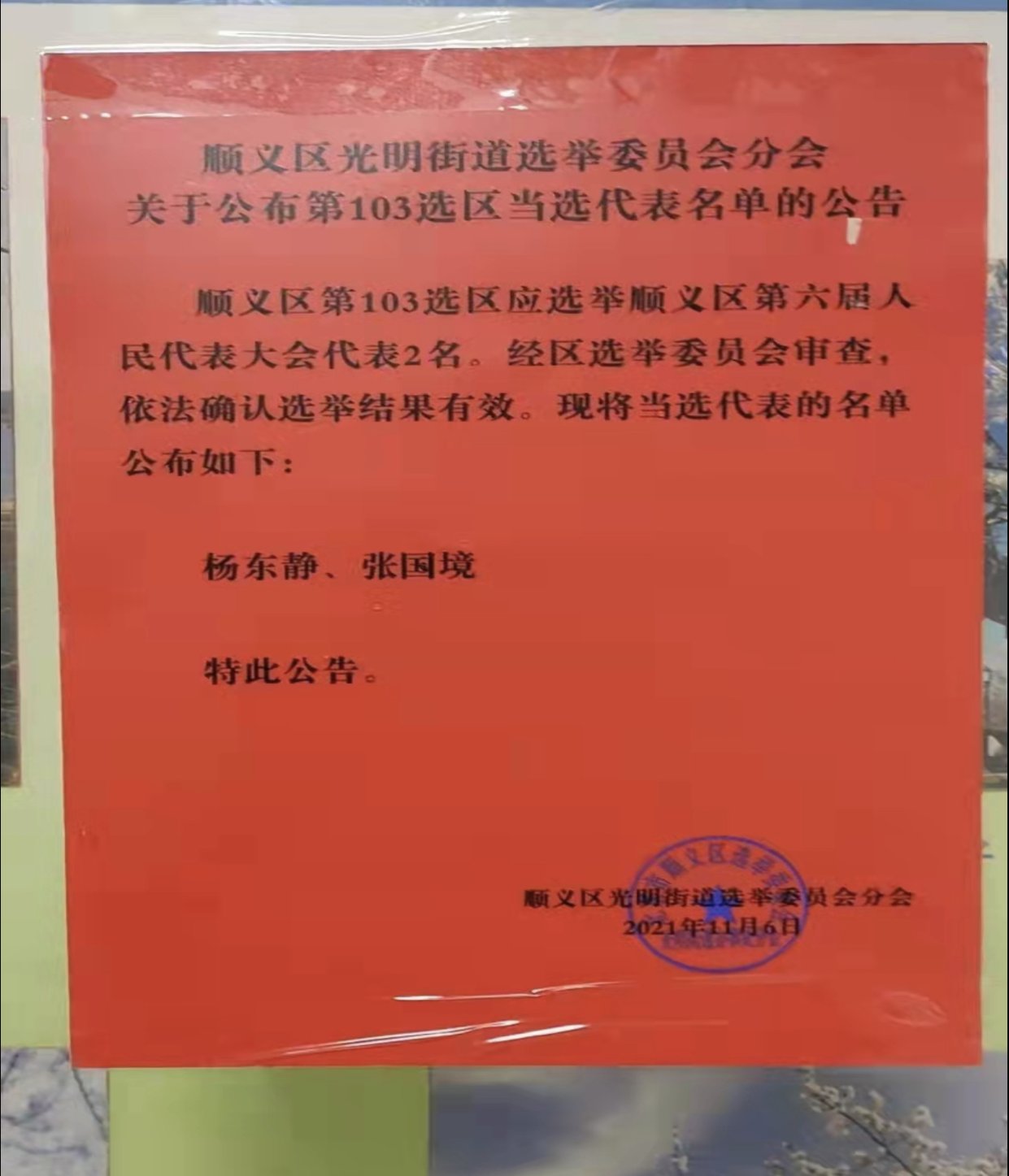 根据选举法和选举实施细则,同人小说 选举工作组已将计票结果上报顺义区选举委员会审查确认,经顺义区选举委员会第5次会议审核确认,选区区人大代表选举结果有效并已公布。同人小说 作为顺义区光明街道选举分会103选区选举工作圆满完成。