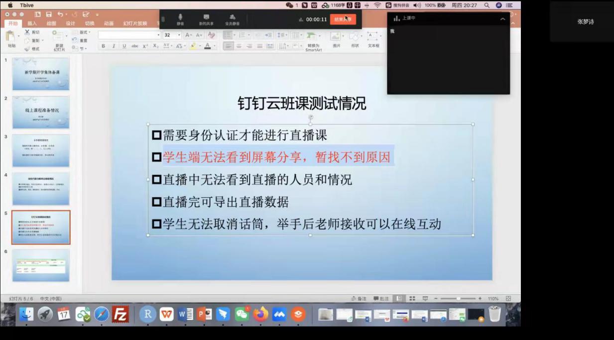 集体备课会议中,学系教师分别从教材选用、参考资料、课件、课后练习等准备情况介绍了所授课程准备情况、钉钉云班课的模拟上课情况及过程中存在的问题,并组织全体人员对线上上课直播流程进行了预演。