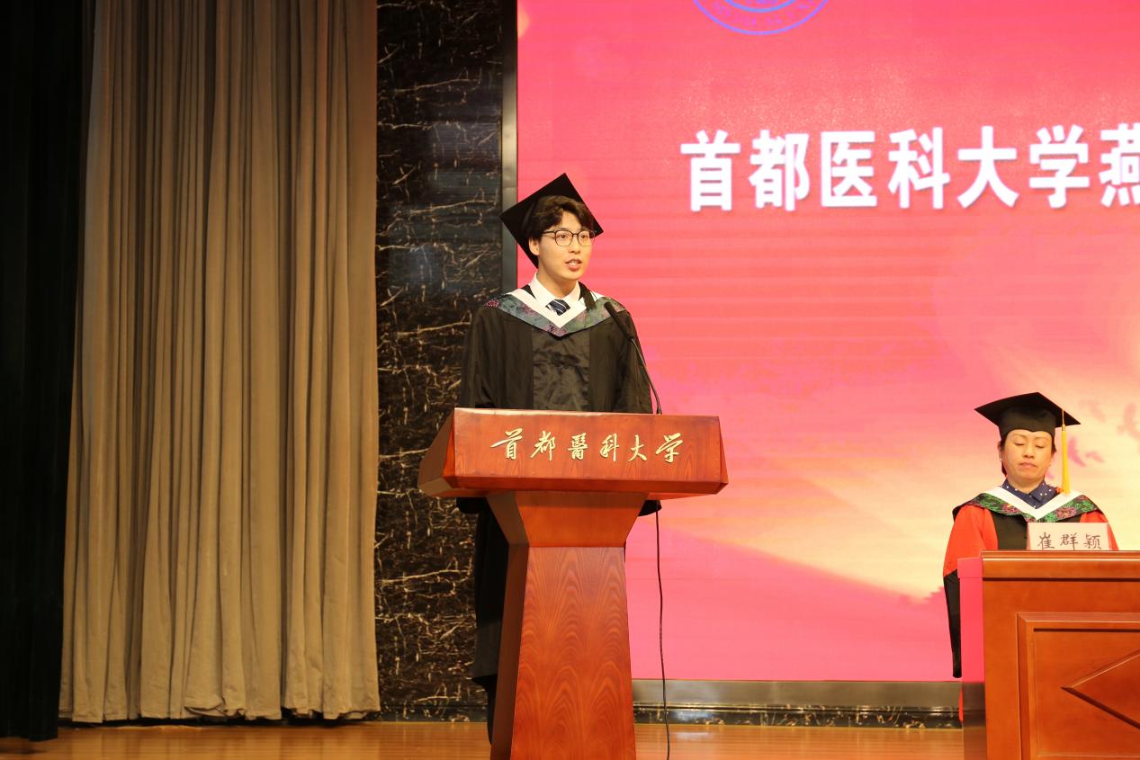 优秀毕业生代表、2018级五年制临床医学(郊区定向)3班的王佳豪回顾了自己大学生活的点点滴滴,深情感恩父母含辛茹苦的养育之恩;感恩学校为他们的成长成才构筑了坚实的平台;感恩所有老师,让他们在亦师亦友的和睦中感到无比温馨;感恩各位同学的友爱与善意,在生活与学习中相互帮助与扶持。