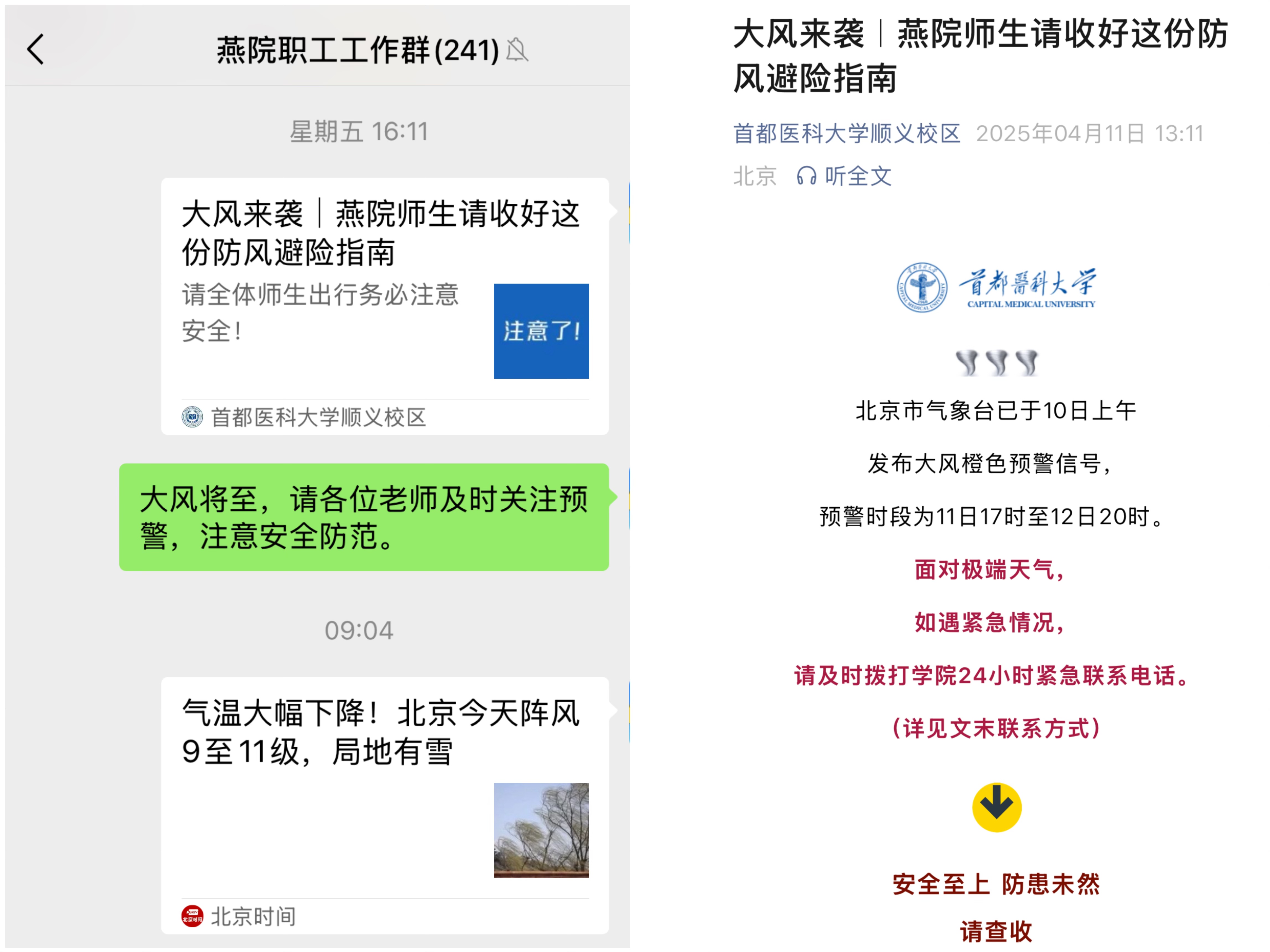 同人小说 通过官方微信公众号、师生联络群等多渠道联动机制,第一时间向全院师生精准推送气象部门发布的预警信息,提醒师生在大风等极端天气条件下及时关好门窗,增强安全防范意识,建议非必要不外出,切实做好个人防护工作。