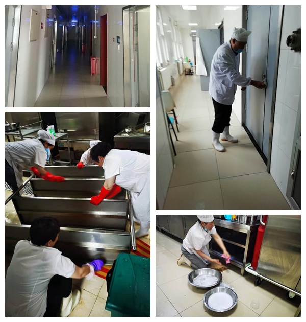 四是加强环境卫生工作。职工对餐厅、后厨进行无死角式大扫除,尽力为军训就餐提供舒适安全的就餐环境。