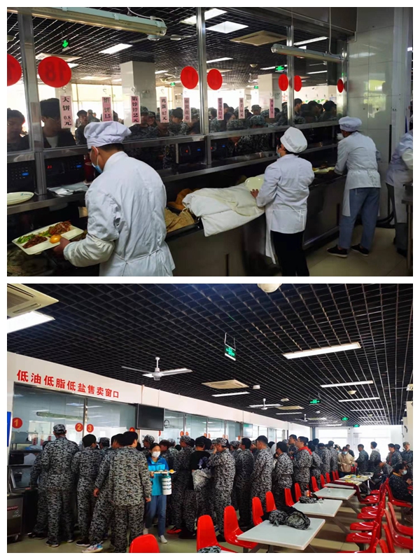二是做好人员保障工作。军训期间工作人员早晨4点到岗,晚上宵夜21点结束,工作时间延长,工作强度也大大增加。军训前食堂对所有员工进行动员,确保所有人员以最好的精神状态完成这次任务。