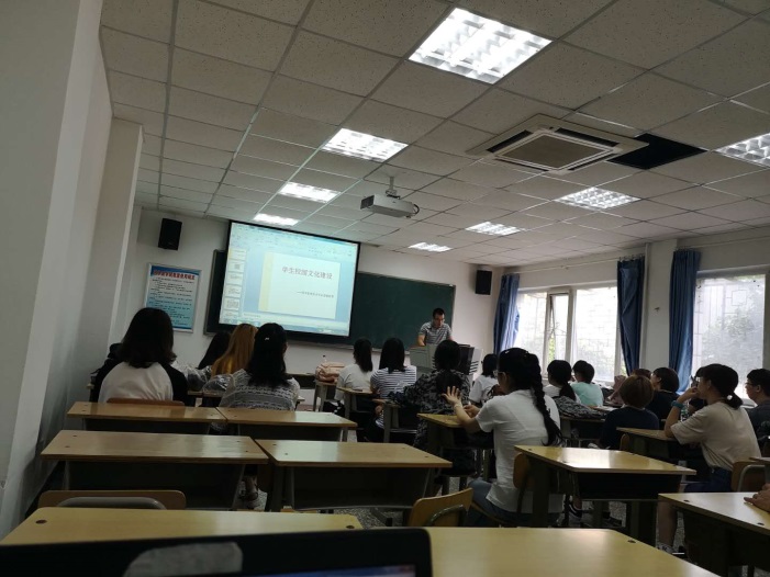 兼职班主任董建鑫老师为全体同学做了题为“大学生的自我管理”的专题教育,分别从上大学的目的,大学能给我们什么,大学自我管理技巧等方面为同学们介绍了如何管理和经营好自己的大学生活。青年教师王川老师做了学生校园文化建设的讲座,从物质文化建设、精神文化建设、制度建设三个方面阐述了什么是校园文化,并给新生们提出了许多有益建议。
