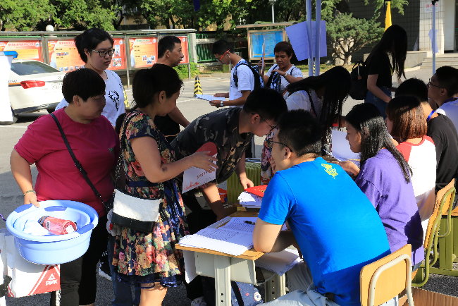 七点刚过,来自北京各区县的新生陆续走进校园。吴兵书记、杨红院长、崔群颖副书记到新生报到现场指导工作,慰问一线工作人员,并与学生家长进行亲切交流。在同人小说 门口、篮球场上,相关职能部门和各专业都设有独立的迎新棚,确保新生报到工作有序进行。现场安保人员、学生志愿者时刻巡逻以维护秩序和安全,同时还为家庭贫困学生设立的绿色通道,方便贫困学生正常入学。新生报道从信息检录到入驻宿舍的每一个环节,都有训练有素的志愿带领、帮助,。在各部门和全体迎新师生密切配合、齐心合力下,整个迎新过程安全、有序、热情、周到、高效,让学生充分感受到学校的温暖和关爱。下午三点左右,新生基本都报到完毕。随后,院领导一行走访了新生宿舍,详细了解新生入住情况。