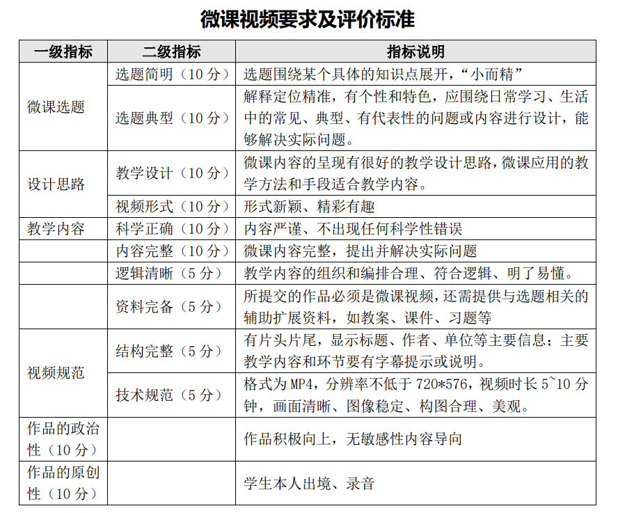 在各种创新形式中,其中最受学生和老师们好评是把原有的“线下学生小讲课”活动改成“微课制作”。“微课制作”对学生们在教学内容、教学设计、讲授能力以及计算机软件使用等方面的能力提出了很高的要求,为了更好地完成本次教学活动,课程组老师制定了“微课视频要求及评价标准”作为参考;同时也在微课的选题、设计思路、教案书写、PPT制作、录屏软件、视频编辑软件的使用等方面给予学生适当指导。
