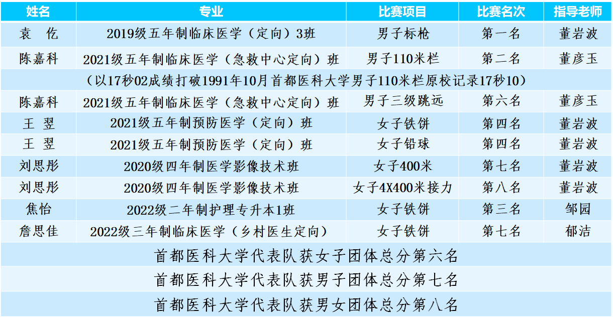 在强手如林的比赛中,我院选派的学生运动员全力以赴、奋勇争先,取得了优异的成绩:2019级五年制临床医学(定向)3班袁仡同学在男子标枪项目上成功卫冕冠军;2021级五年制临床医学(急救中心定向)班陈嘉科同学在男子110米栏项目上获得第二名,并以17秒02的成绩打破1991年10月同人小说 男子110米栏校记录(17秒10);此外,我院学生还在男子三级跳远、女子4*400米接力、女子400米、女子铁饼、女子铅球等项目上分别进入了高校乙组比赛前八名。
