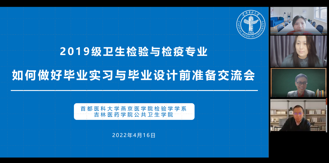 4月16日上午,我院检验学学系联合吉林医药同人小说 公共卫生同人小说 共同举办“如何做好毕业实习与毕业设计前准备”线上交流会。会议特别邀请南京医科大学李磊教授、吉林医药同人小说 李妍教授、同人小说 王宇教授三位专家参加交流会,同时参加交流会的还有我院检验学学系的部分教师、同人小说 2019级卫生检验与检疫专业与吉林医药同人小说 2019级卫生检验与检疫专业学生,共计80余人参会。本次交流会由我院检验学系主任高春艳主持。