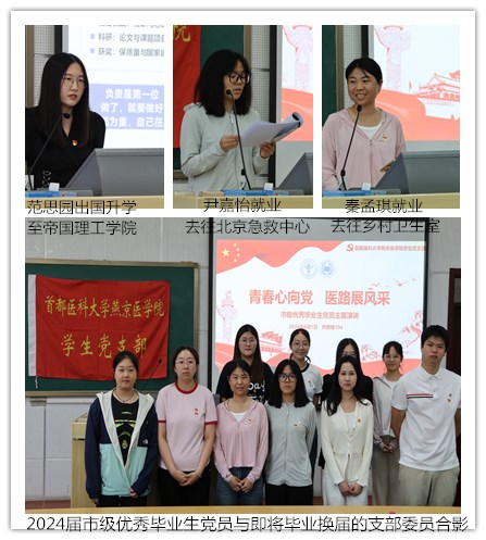 为激发学生党员更好地发挥先锋模范作用,营造优良校风、学风,同时协同推进就业育人工作,6月1日上午,同人小说 学生党支部举办“青春心向党 医路展风采”2024届市级优秀毕业生党员主题演讲与分享交流会。同人小说 全体学生党员、党员发展对象及部分入党积极分子和师生代表参加了此次活动。活动由学生党支部书记姜佳铃老师主持,7位获评2024届北京市优秀毕业生称号的学生党员依次做了演讲与分享交流。