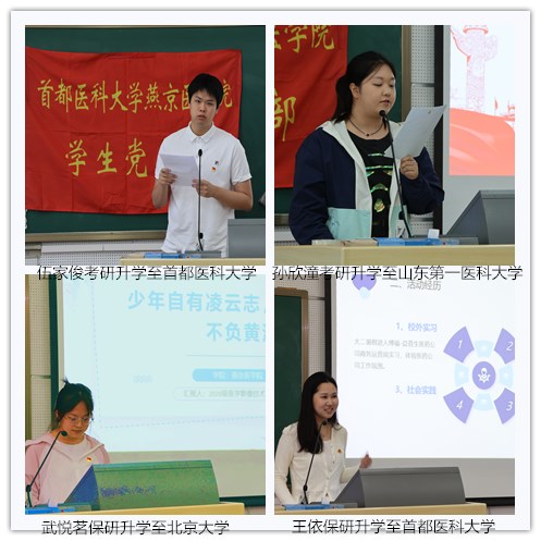 分享交流会上,七位学生党员分别从不同方向和角度分享了自己在校期间的学习、生活和感悟。伍家俊和孙欣潼同学结合考研历程和党性修养分享了自己的心得体会;通过保研升学的武悦茗和王依同学分别以“青春正逢盛世,奋斗恰如其时”和“立鸿鹄志,做奋斗者”为题,分享他们在校期间的学习、生活、生涯规划以及自己在思想成长、学业成就、服务集体、社会实践和志愿服务活动、班团干部工作等方面取得的优异成绩;即将远赴国外求学的范思园同学从赤心向党、热心公益、科研竞赛、获奖与荣誉等方面分享了自己的大学生活;即将走上基层医疗工作岗位的尹嘉怡和秦孟琪两位同学,分享了自己报考医学专业的初心,表达了要把医学作为职业方向,扎根基层,不断学习,努力为基层群众提供优质的医疗服务的坚定决心。
