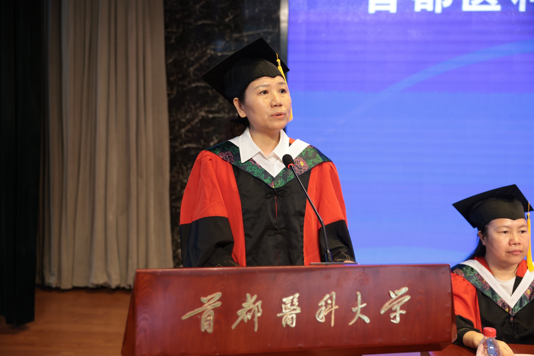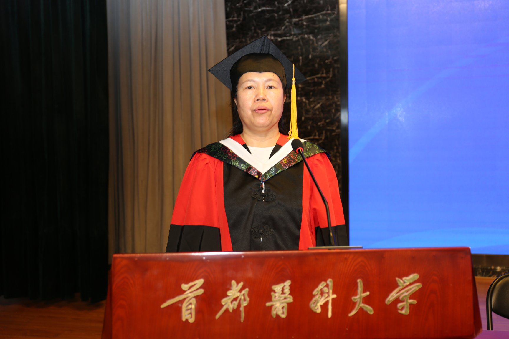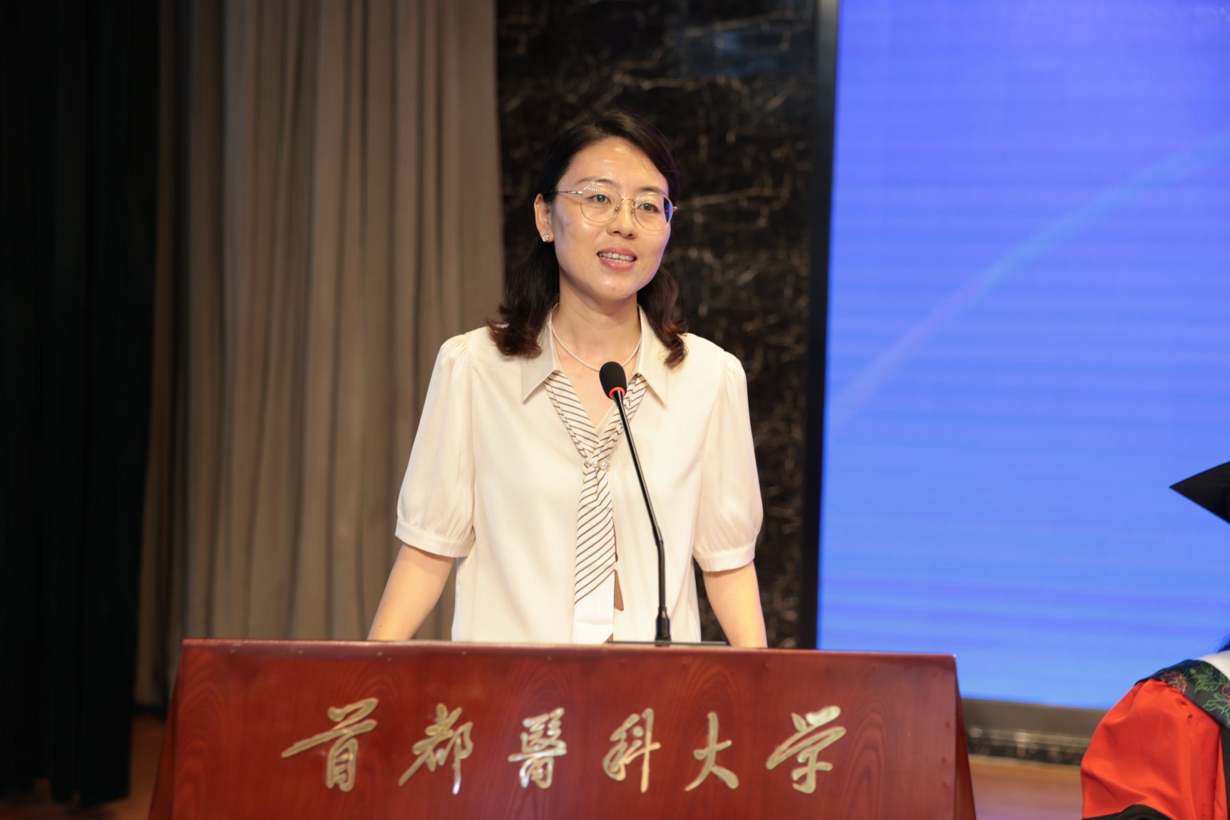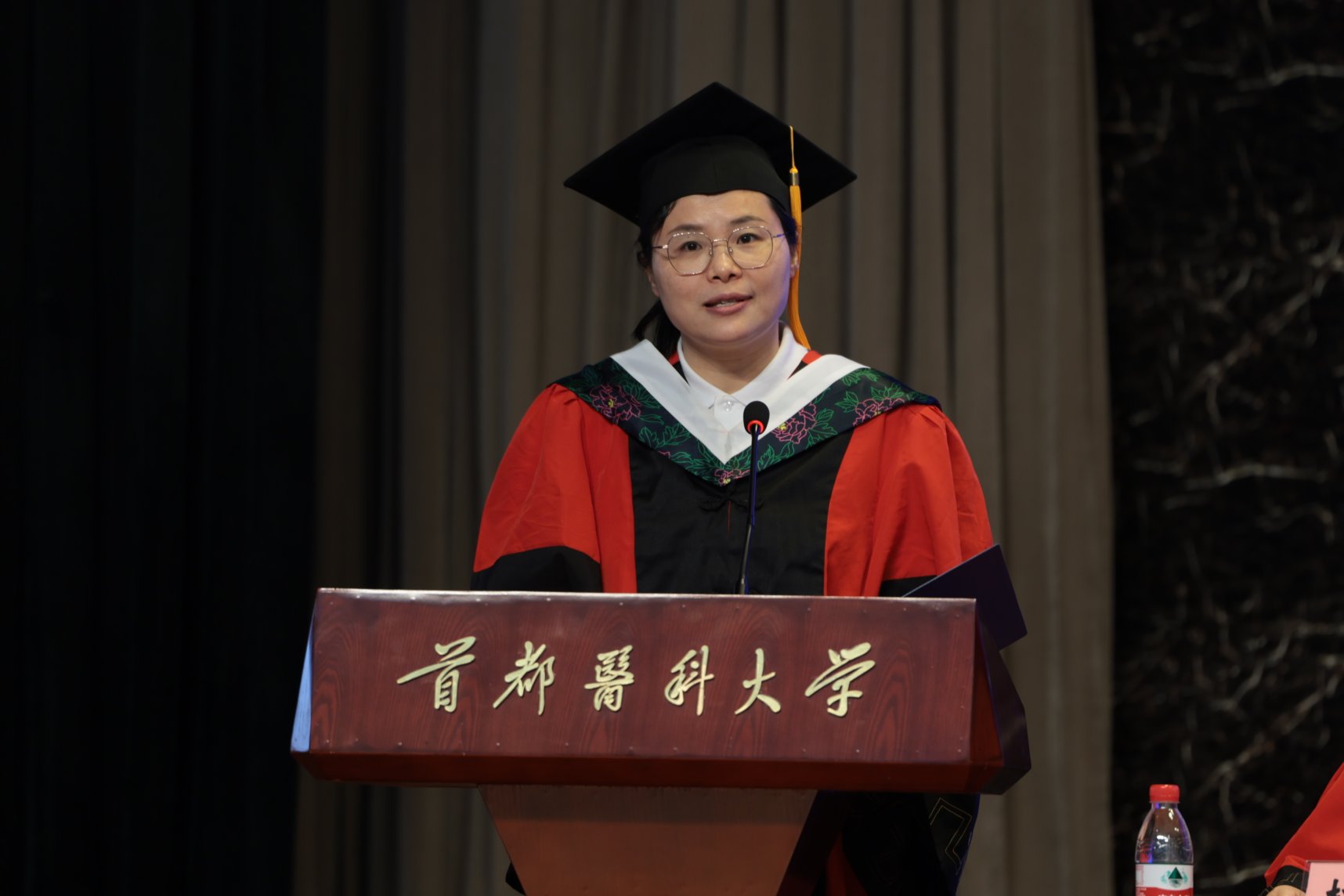 临床医学学系教师李囡作为教师代表在致辞中为毕业生送上了三点鼓励与祝福,一是保持善良和真诚,做一个有温度的人;二是保持学习的热情,勤奋进取,做一个对社会有用、被时代需要的有为青年;三是善待自己,关爱家人朋友,做一个有责任有担当的人,最后祝愿毕业生们都能在人生的舞台上绽放出耀眼的光彩,成为独一无二的自己。