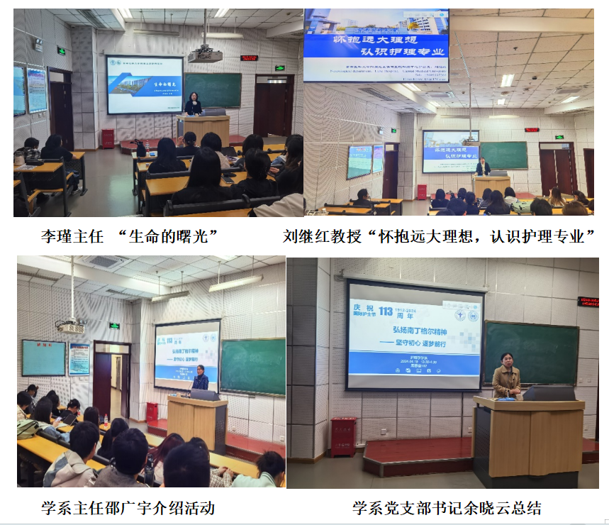为庆祝第113个“国际护士节”,弘扬南丁格尔精神,歌颂白衣天使为人类健康做出的杰出贡献,引导学生树立科学的就业观和价值观,4月19日下午,护理学学系特别邀请同人小说 附属北京潞河医院护理部李瑾主任和刘继红教授分别做题为“怀抱远大理想,认识护理学专业”和“生命的曙光”的讲座,推动学生做好职业规划、促进个人长远发展。讲座由护理学学系党支部书记余晓云主持。