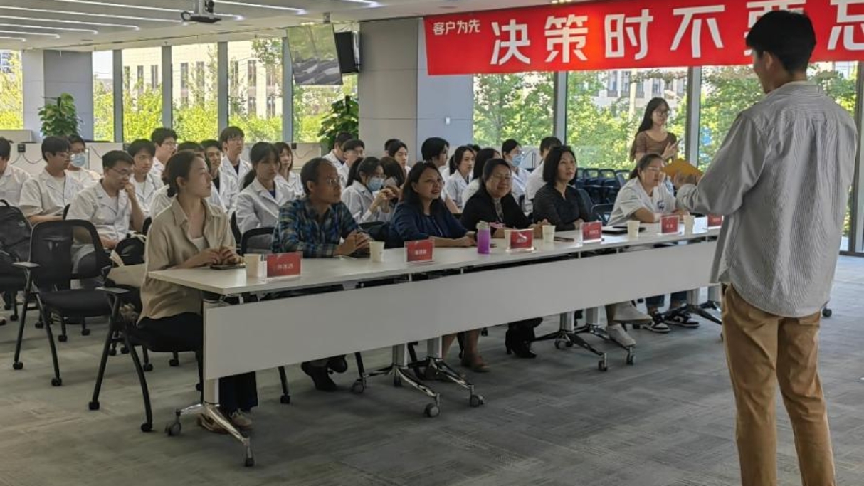 活动伊始,师生们在体检中心工作人员的带领下深入各个诊室,了解体检中心科学、合理的布局设计和诊室里先进的医学设备。随后,活动进入宣讲环节。京东集团工作人员向师生介绍了企业的发展历程、京东健康的价值理念及体检中心的岗位人才需求情况;京东健康体检中心的放射技师与大家分享了自己的工作经历和职业路径。同学们积极参与互动,现场氛围热烈而活跃。