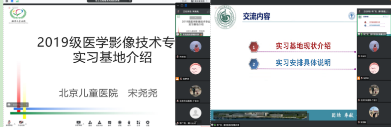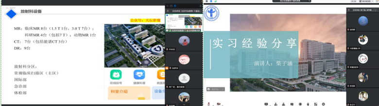 北京同仁医院牛延涛主任及刘丹丹老师介绍了基地情况,2018级医学影像技术班的柴子涵介绍了自己在北京同仁实践教学基地的实习情况,她从普放、CT、MRI和介入的临床实习工作内容、培训和学习的内容、阶段性考核的相关事宜、毕业设计和毕业后的一些方向等多项内容进行了分享。