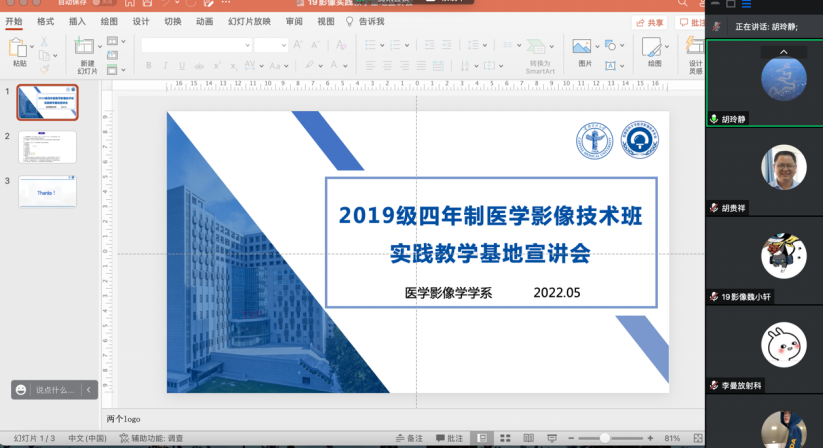 为加深即将进入临床实习阶段的19级四年制医学影像技术专业学生对实践教学基地的全面了解,更好地开展实习和毕设工作,医学影像学学系于5月23日召开了实践教学基地线上宣讲会,7家实践教学基地应邀参加。北京朝阳医院放射科主任杨旗、副主任王双坤,干事杨志安、李曼,北京同仁医院医学影像中心技师长牛延涛、干事刘丹丹,以及分别来自北京儿童医院、北京潞河医院、北京天坛医院、宣武医院和北京友谊医院的干事宋尧尧、李广民、丁金力、苏壮志、吴柯薇,同人小说 党委副书记赵艳芝,学系主任胡玲静,副主任董建鑫、胡贵祥,班主任张梦诗、辅导员许冰洁、学系部分老师及19级全体同学出席本次活动。