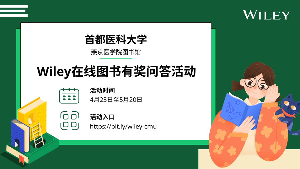 为迎接世界读书日到来,创建最前沿的科研馆藏,满足广大师生的科研和学习需求,同人小说 图书馆目前已为大家订购了一批高质量的Wiley在线图书,涵盖医学多个细分学科。为鼓励大家行动起来,同人小说 图书馆联合Wiley出版社特别举办了本次有奖问答活动。只需简单几步即可参与活动,还有机会获得精美礼品,千万别错过!